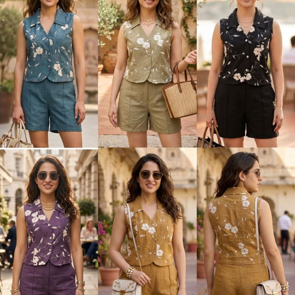 Teal, Olive Green, Black, Purple, Mustard Yellow with white floral print Matching set (sleeveless collared top and shorts)₹2195.00