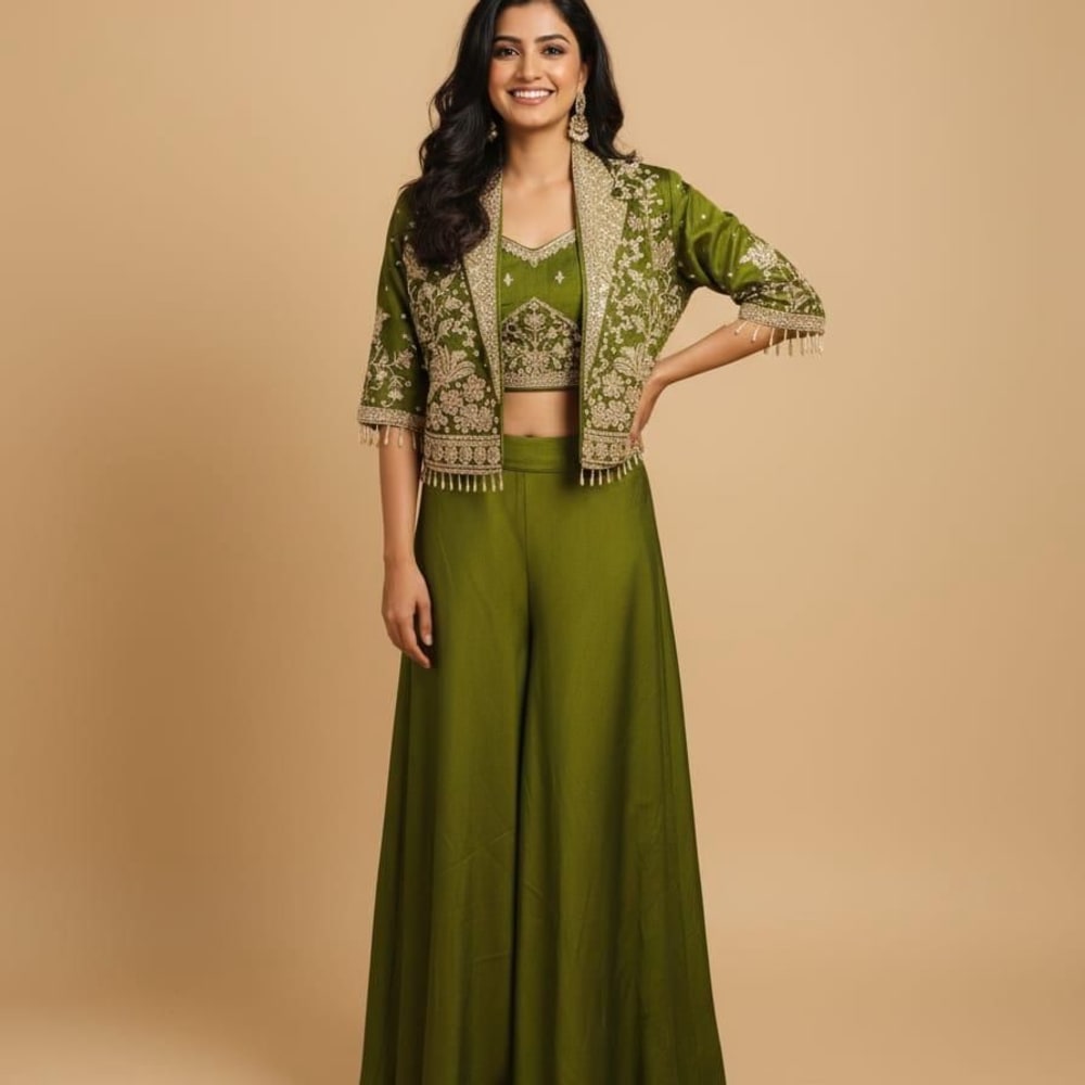 Olive Green, Gold Crop top, Jacket, Palazzo pants