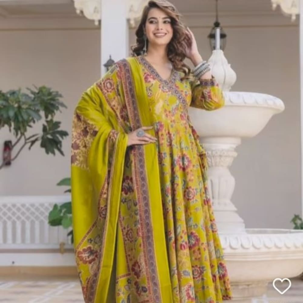 Lime green, red, brown, and off-white Anarkali Suit with Dupatta
