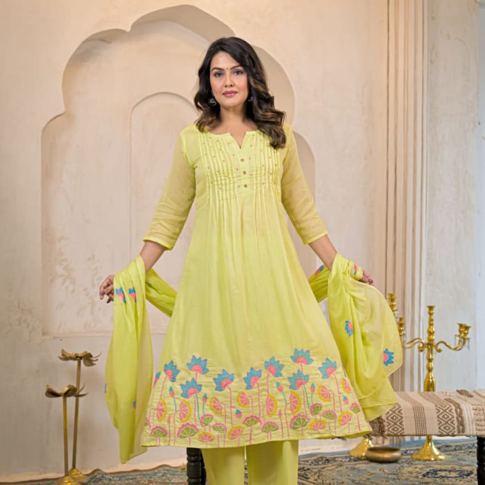 Light Yellow, with Multi-colored embroidery (Blue, Pink, Yellow, Green) Anarkali Suit