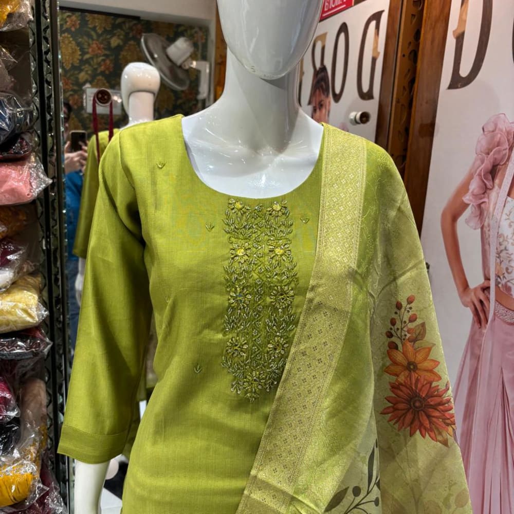 Green, with hints of orange and gold in the dupatta. Salwar Kameez (Kurta and Dupatta)