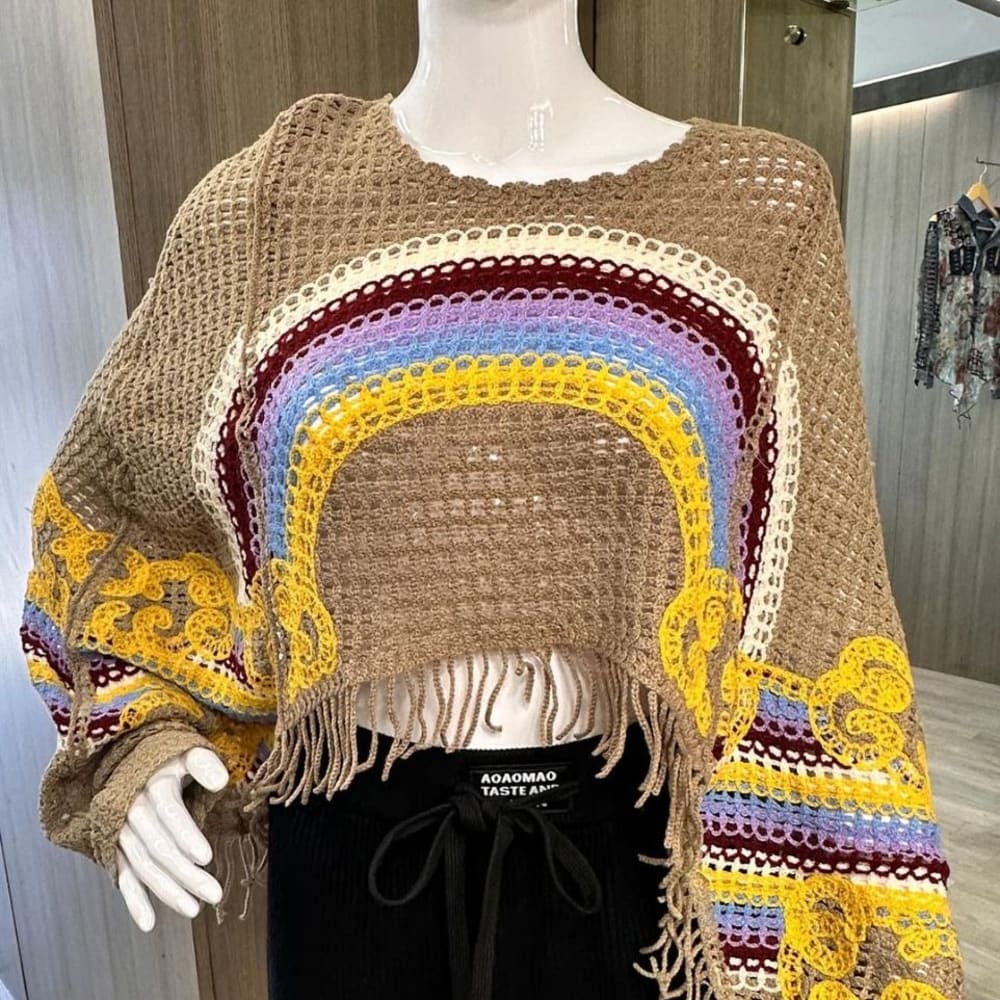 Brown, Rainbow colors (red, purple, blue, yellow), White Sweater