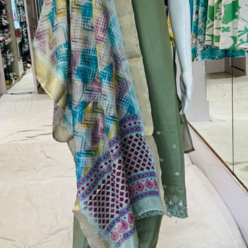 Green, blue, purple, yellow, and beige Salwar Kameez with dupatta